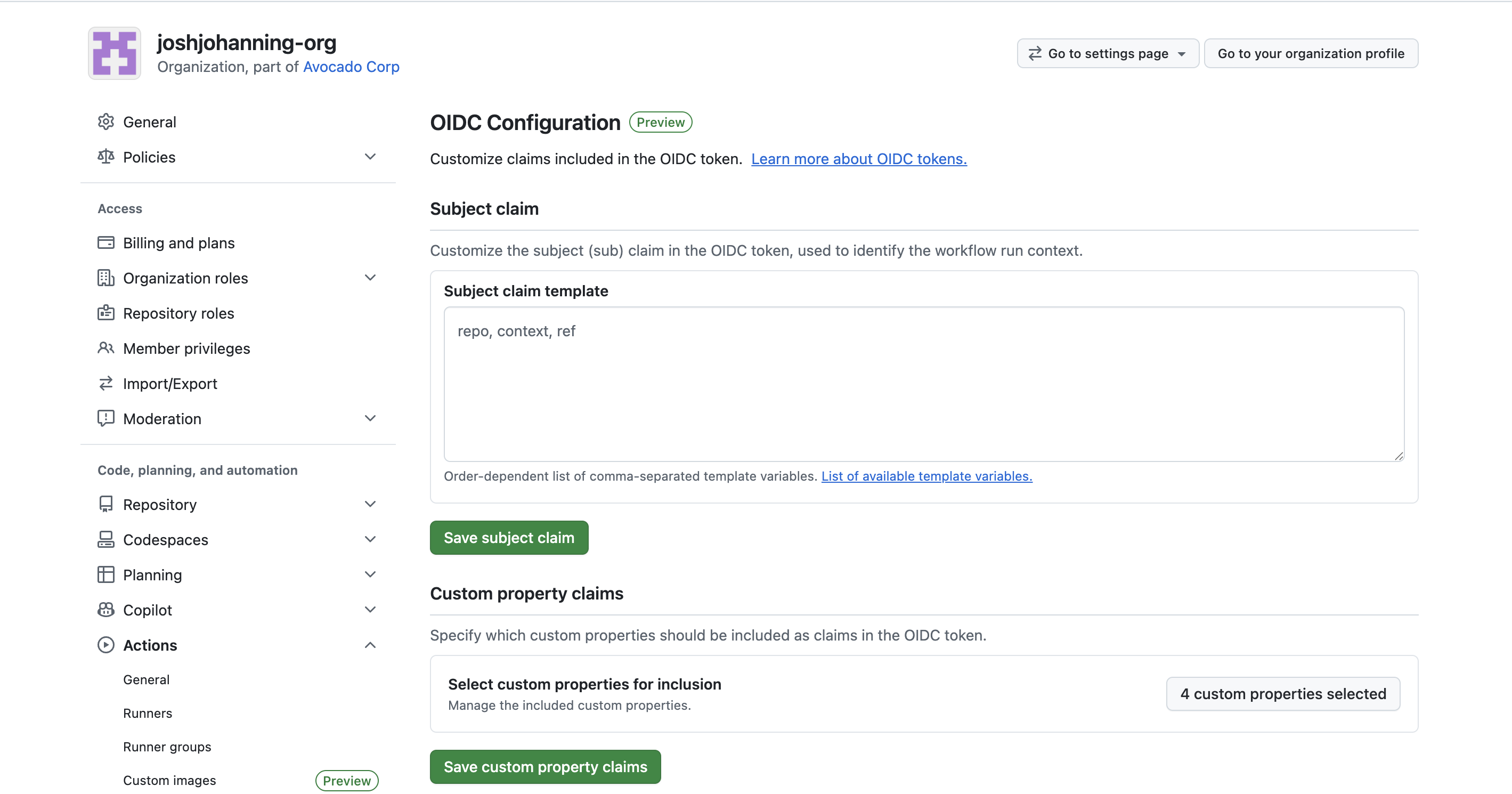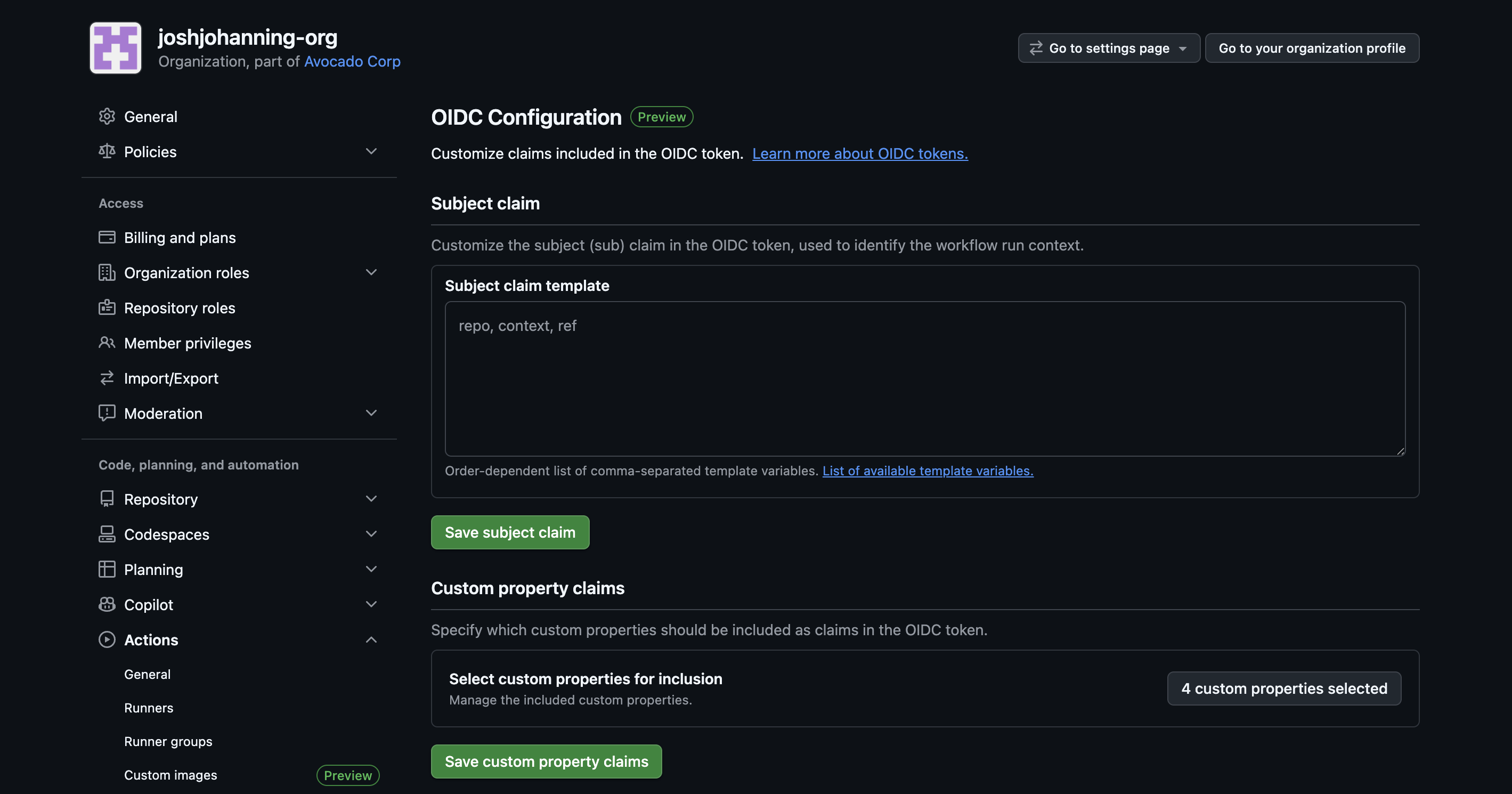 Previously, customizing OIDC claims meant calling the REST API (or using the gh oidc-sub extension) for each individual repository. Alongside custom properties, GitHub also shipped a new OIDC Configuration settings page that lets you manage both the subject claim template and custom property claims from a single UI - no API calls needed. With custom properties, you configure which ones to include in OIDC tokens once at the org level, and every repo with that property set automatically gets the right claims.