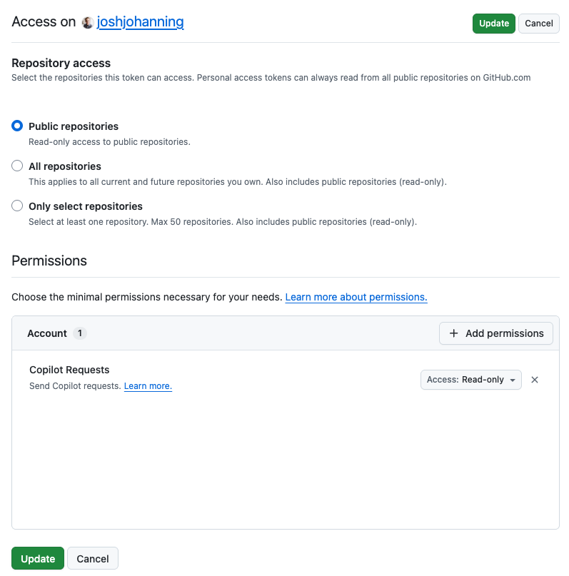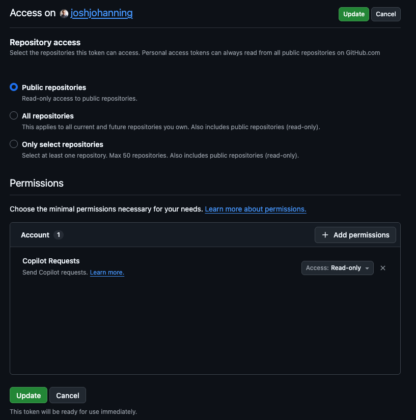 Fine-grained PAT with Account > Copilot Requests: Read-only permission and Public repositories access
